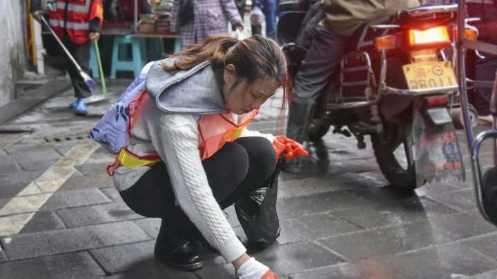 在清洁途中虽然下着绵绵细雨,但是志愿者们并没有因为恶劣的天气而退缩,每一个人都拿出不怕脏不怕累的精神,跟着环卫工人仔细的打扫着街道上的每一片瓜皮纸屑,他们这一行为受到了路人的高度赞扬。
