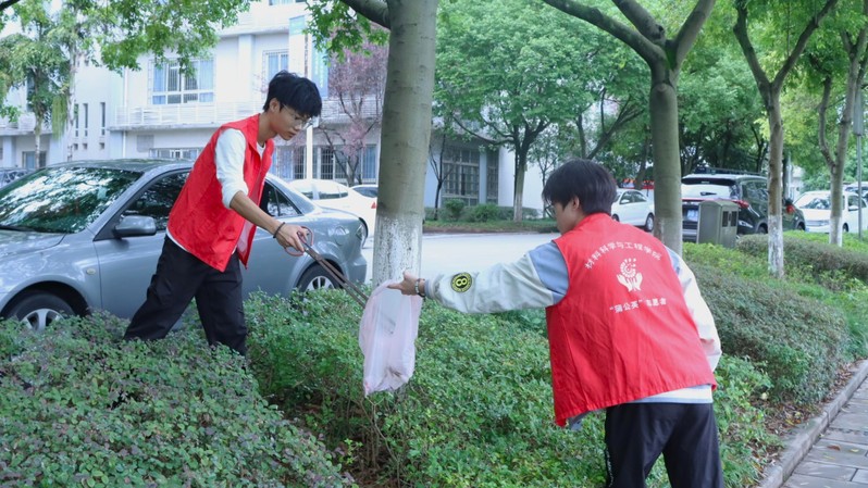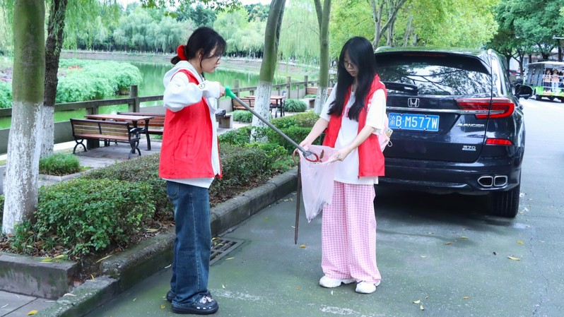 活动现场,身着统一红色马甲的志愿者们化身“生态守护者”,秉持“全覆盖、无死角”原则开展清洁行动。他们分组协作、默契配合,重点清理湖岸草丛、石缝及步道边缘的烟头、塑料碎屑、果皮等废弃物。经过近两小时的细致清理,鉴湖沿岸环境卫生面貌焕然一新,原本隐匿的垃圾被彻底清除,沿岸步道整洁有序,为校园增添了秋日生机。