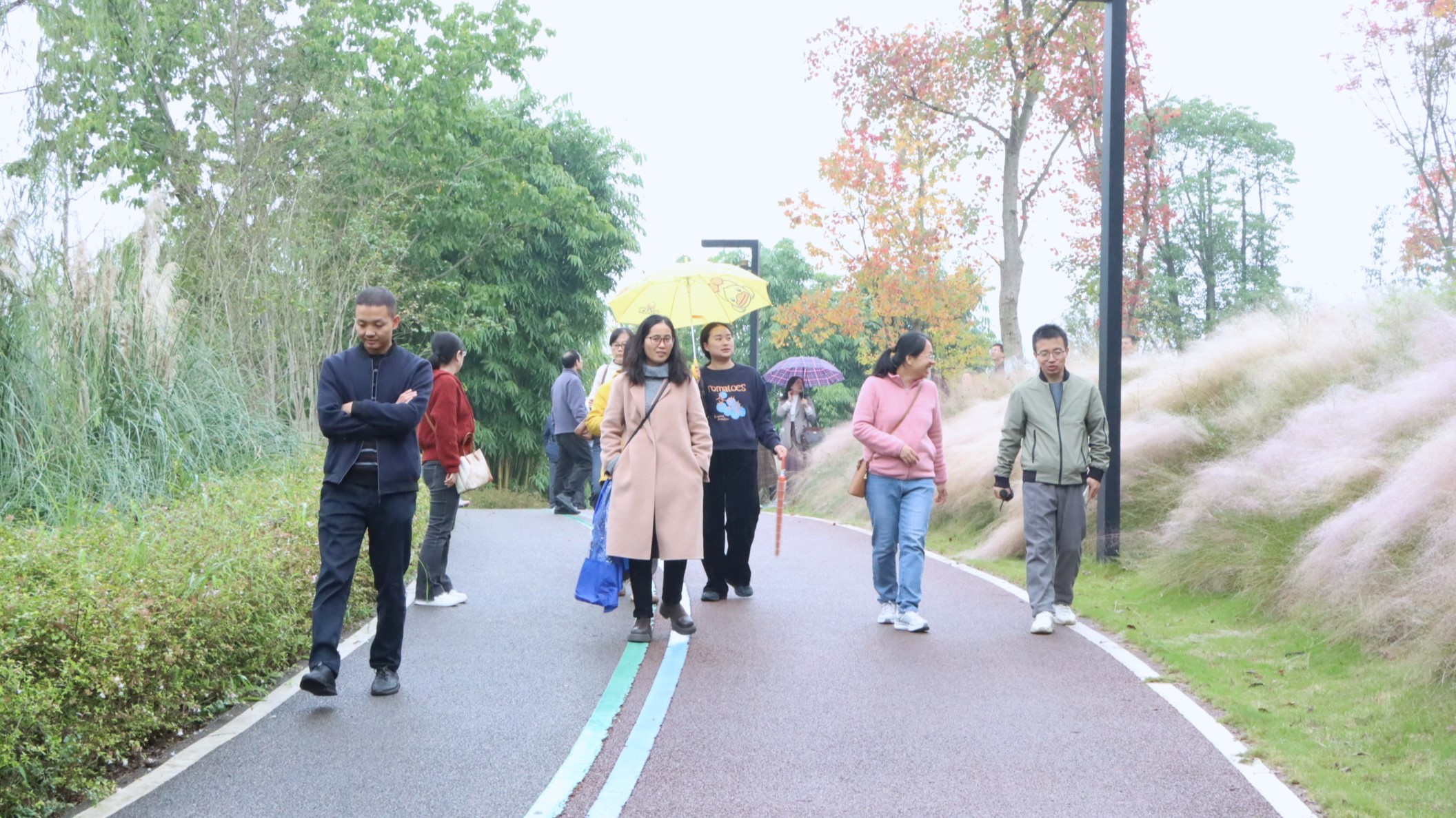 随后的环湖徒步活动节奏舒缓,为教职工提供了放松身心的机会。慧谷湖畔秋意正浓,银杏叶缀满小径,芦苇随风摇曳。大家或结伴漫步,欣赏湖光水色、偶遇水鸟;或驻足于斑斓秋树下,由摄影爱好者捕捉温馨瞬间。暖阳洒落,秋色宜人,平日的工作压力在自然的怀抱中得到有效缓解,身心得以充分放松。