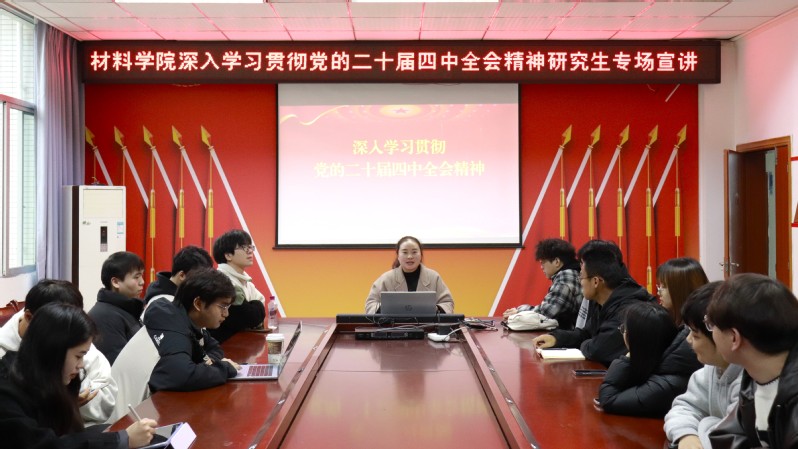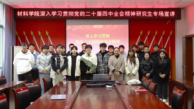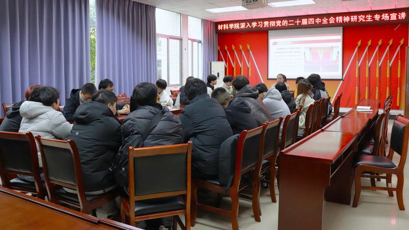 12月4日下午,材料科学与工程学院在崇智楼210会议室召开“深入学习贯彻党的二十届四中全会精神”研究生专场宣讲会。会议由2025级研究生辅导员邓先蓉老师主讲,全体2025级研究生参加。