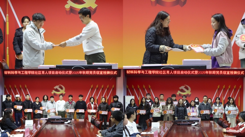 12月10日晚,材料科学与工程学院于崇智楼210会议室举行社区育人项目启动仪式暨2025年秋期党员授牌仪式。学生第一党支部书记余营、学生第二党支部书记邱地以及全体学生党员参会,学院社区专员刘梦真主持会议。