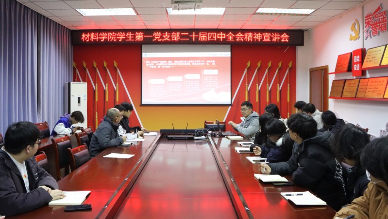 12月30日晚,材料科学与工程学院学生第一党支部于崇智楼210会议室开展党的二十届四中全会精神宣讲会。学生第一党支部全体党员参会,党支部书记余营主讲。