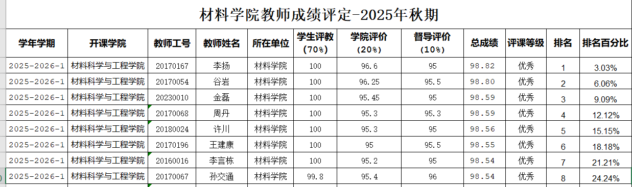 根据《长江师范学院本科课堂教学质量评价办法(修订)》(长师院办发【2025】54号)和《材料科学与工程学院本科课堂教学质量评价实施细则(试行)》文件精神,学院本科课堂质量评价工作组组织完成了2025年秋期本科课堂教学质量综合评定工作。经学生评价(占比70%)、督导评价(占比10%)、学院综合评价(占比20%)三部分成绩加权计算,现将拟评定为“优秀”等级的教师名单予以公示。